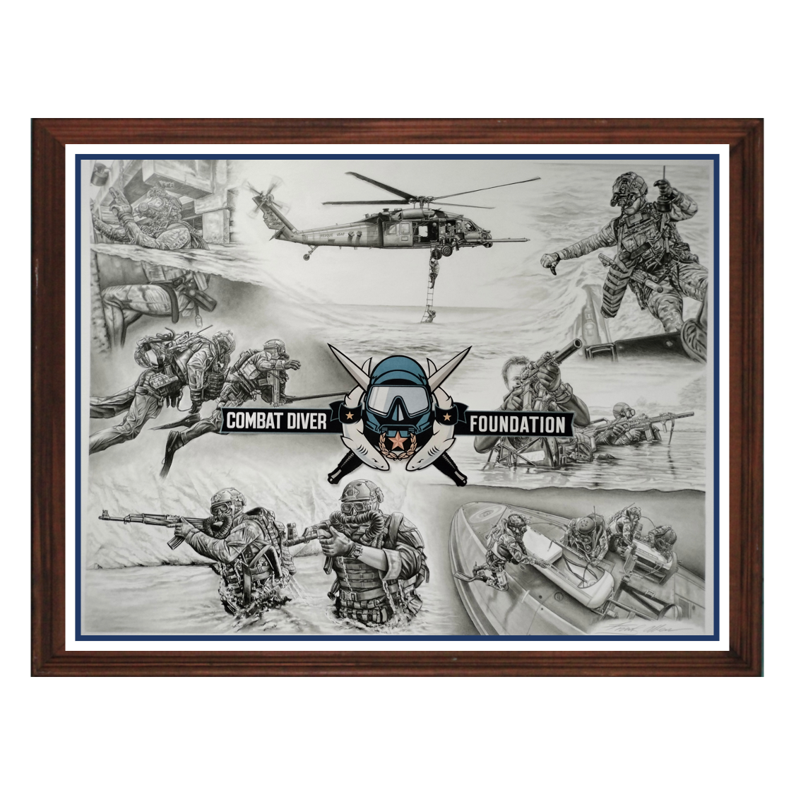 Frank's work truly captures the energy and danger of maritime operations and illustrates the variety of skills that Combat Divers must maintain in order to close with and destroy the enemy. His black and white prints have been featured in the Oval Office and grace the hallways and common areas at the Pentagon, SOCOM, NATO Special Operations Headquarters, 5th Special Forces Group, and more! Now you can have one in your office or living room as well.