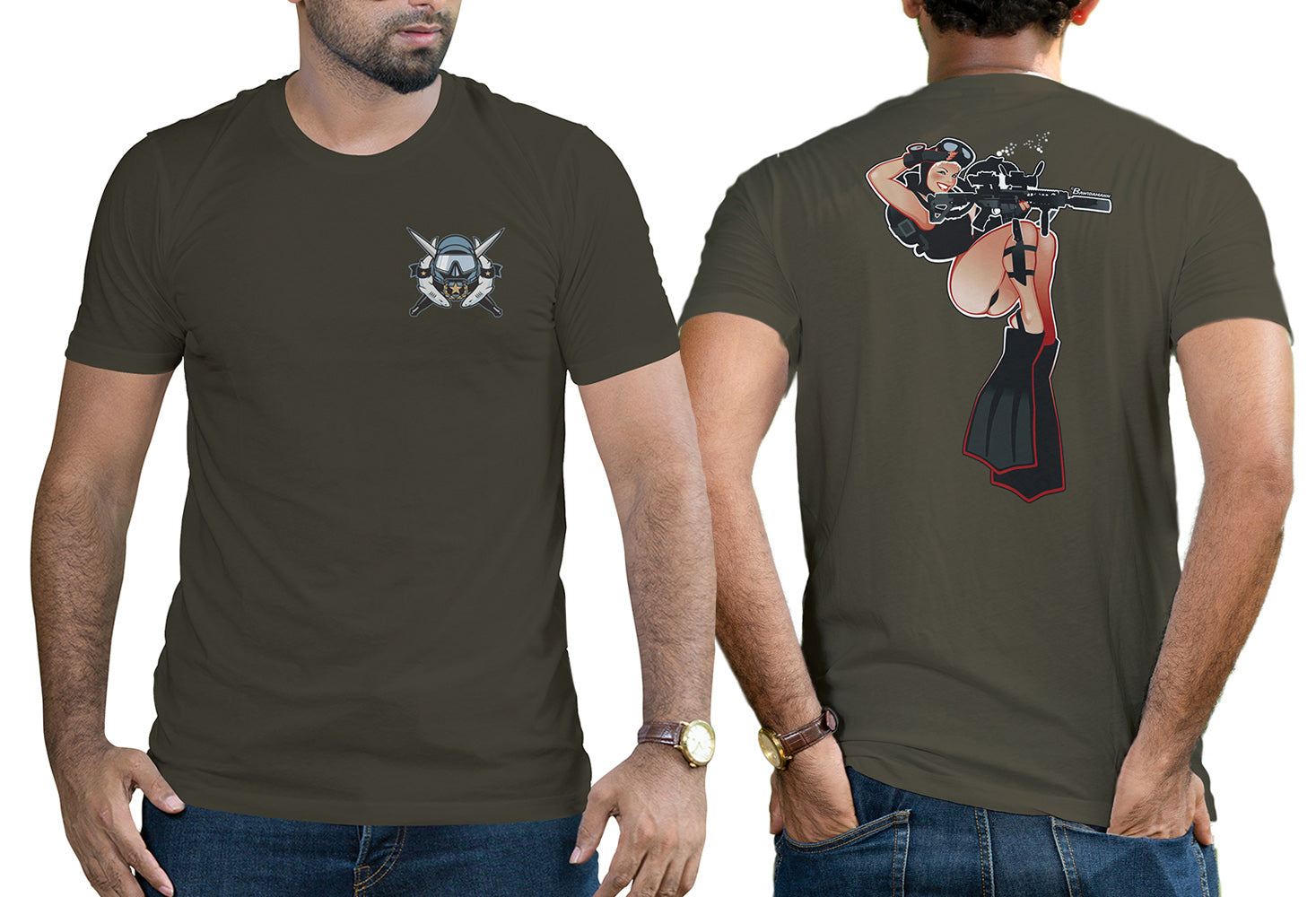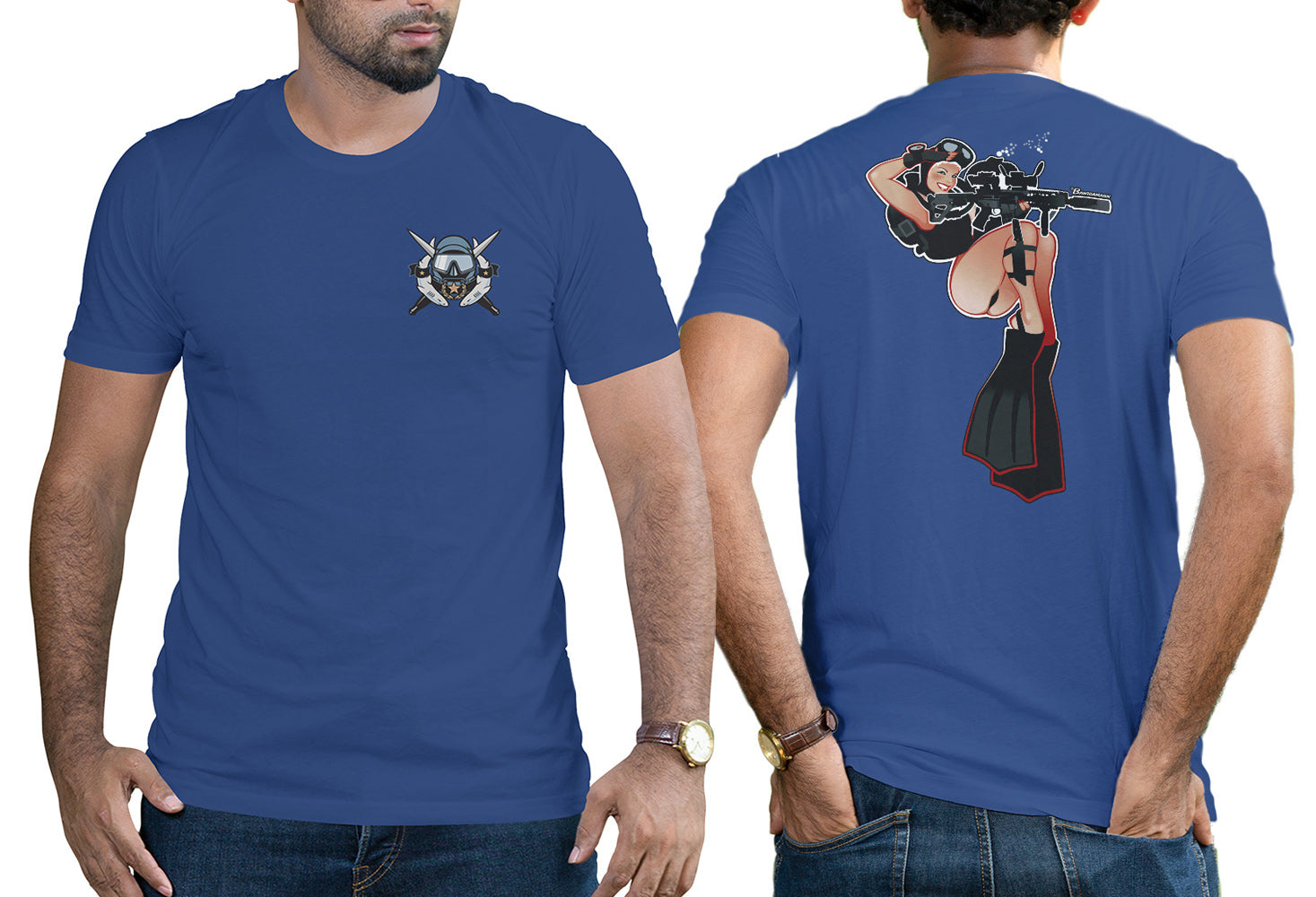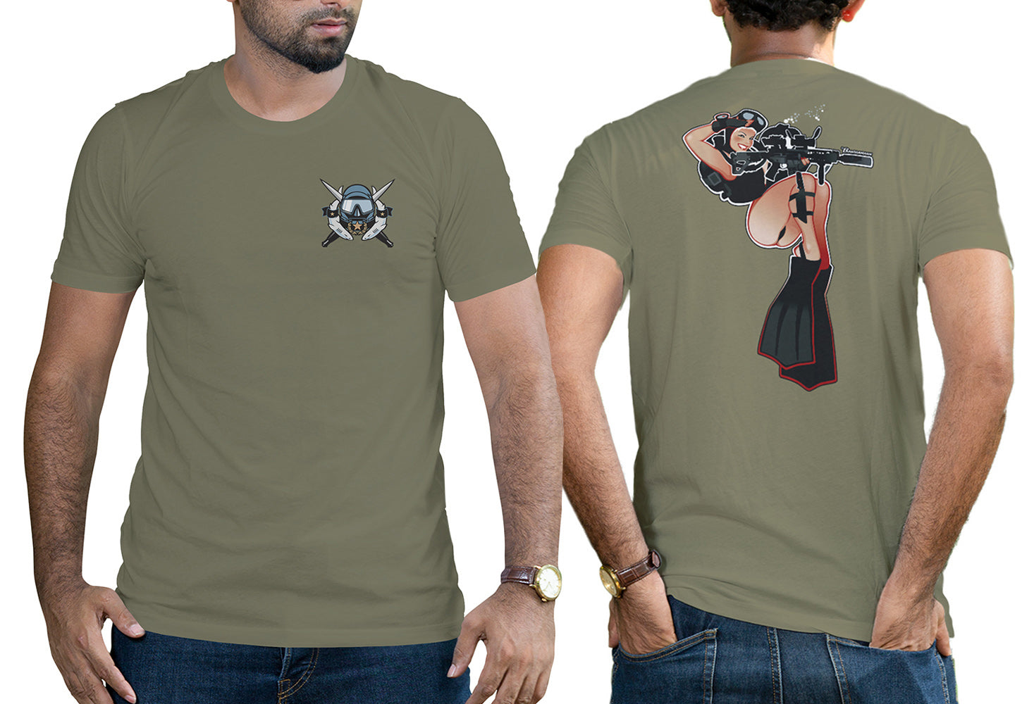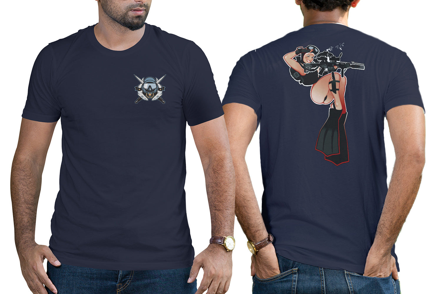 Get the fantastic "Diver Girl" shirt popular with Combat Divers! You'll find Diver Girl's gorgeous face on Special Forces ODA and SEAL Platoon shirts around the world and now you can get one for yourself! Exclusively authorized for the CDF Store by the artist, Andrew Bawidamann.