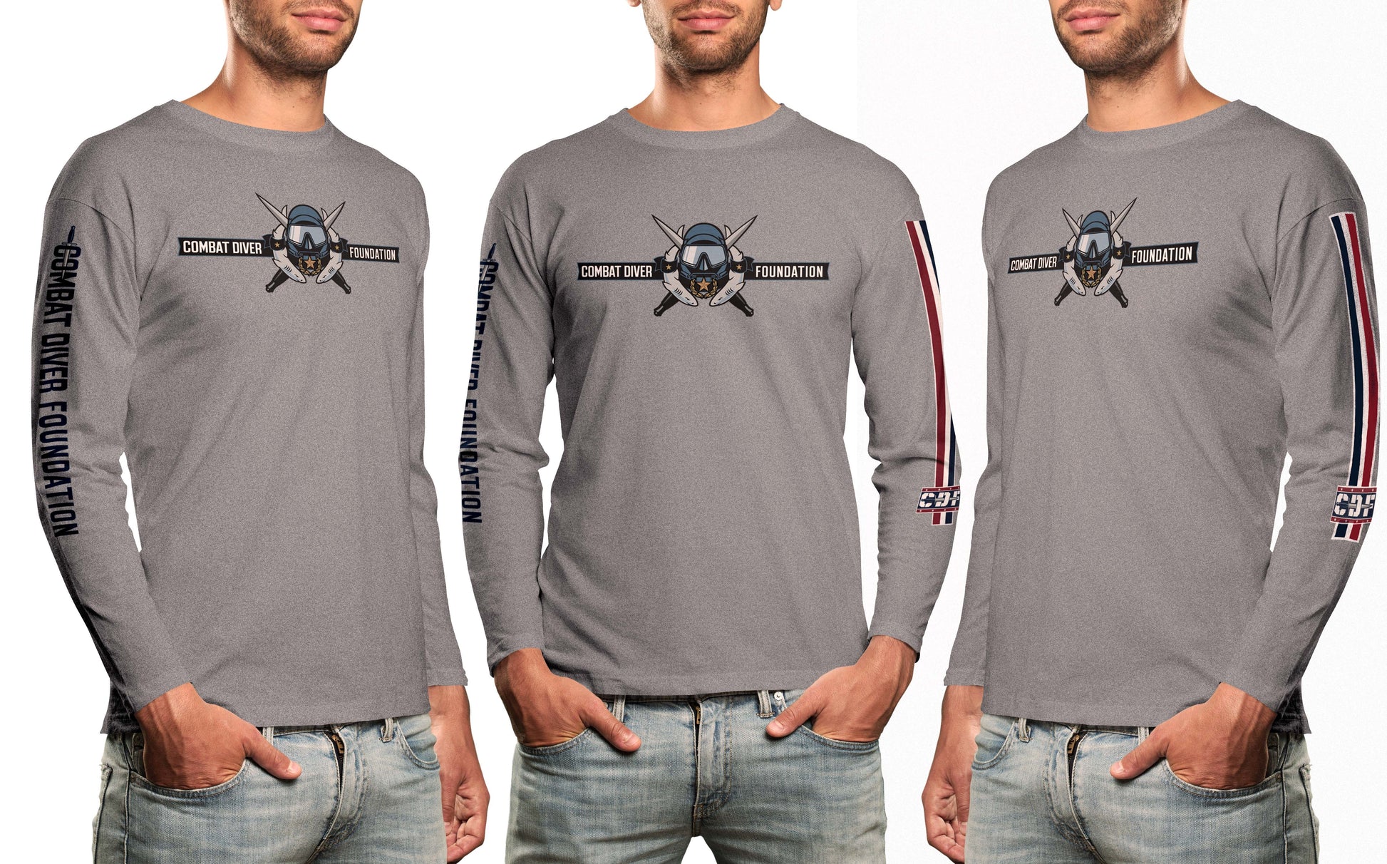 You asked and we delivered. Presenting the awesome CDF Logo Shirt but with long sleeves! Features some fantastic sleeve art with "COMBAT DIVER FOUNDATION" on the right sleeve with the Sykes-Fairbairn OSS fighting knife that's such a part of our history; and a red, white, and blue banner with the new CDF Sport Logo on the left.