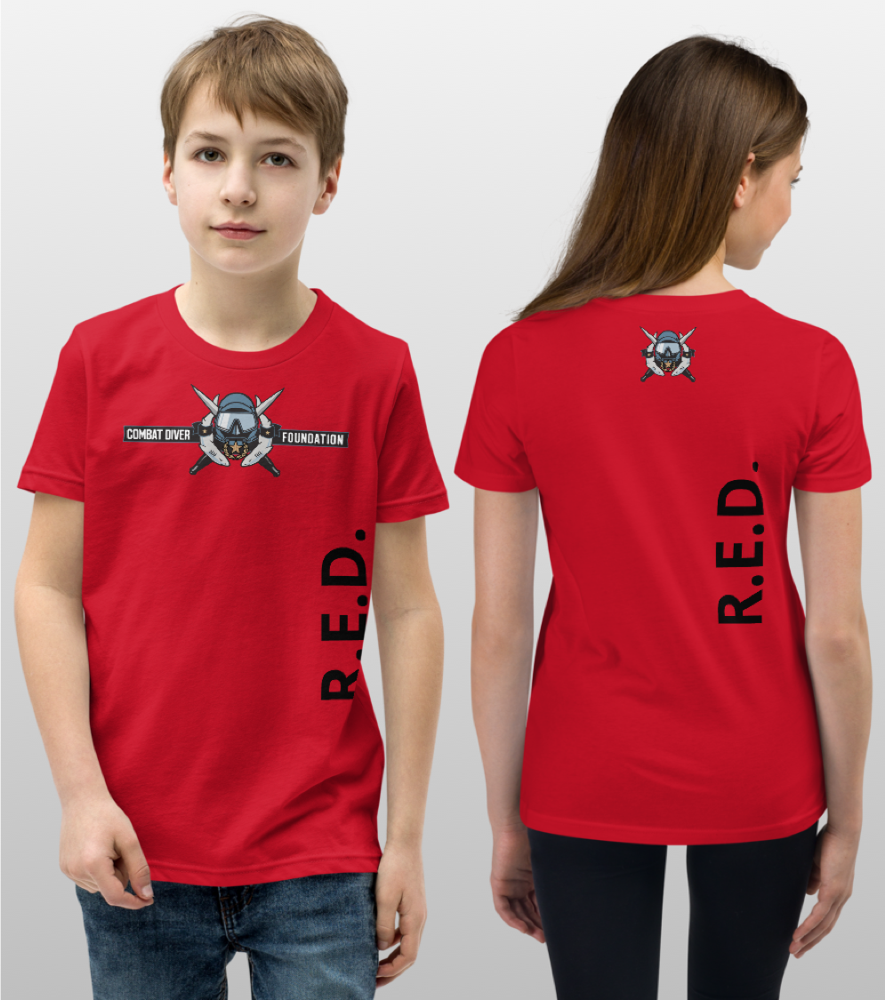 "Remember Everyone Deployed" Next Level CVC t-shirt featuring the CDF horizontal logo on the front and the CDF logo at the base of the neck. Contains the text "R.E.D." down one side of the shirt. Available also in kid's sizes.